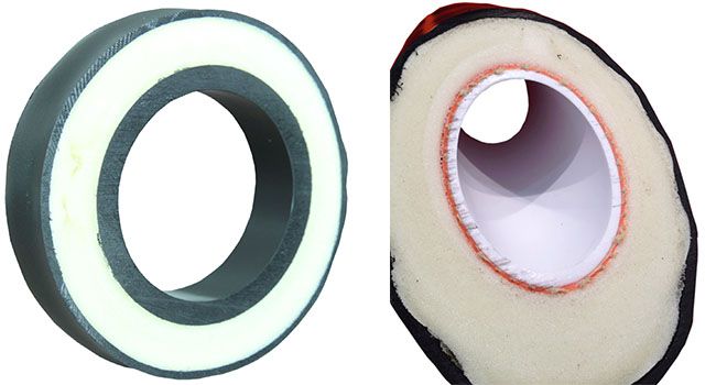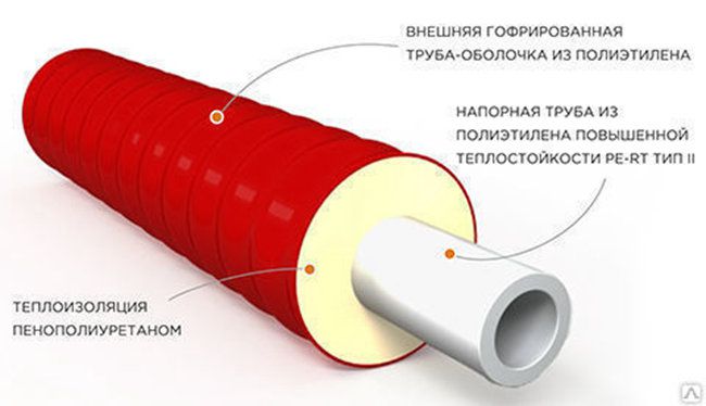 Труба в ППУ PERT cостоит из напорной трубы из полиэтилена повышенной теплостойкости PERT тип II, теплоизоляции пенополиуретана и внешней гофрированной трубы-оболочки из полиэтилена.